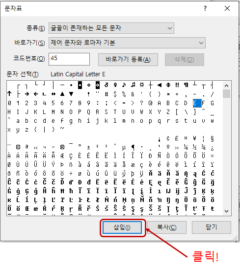 문자표에서 'E'를 찾아 클릭하고 삽입합니다.