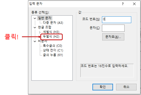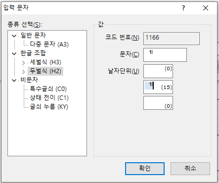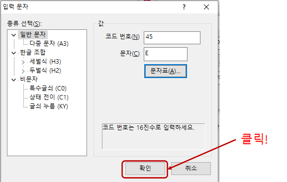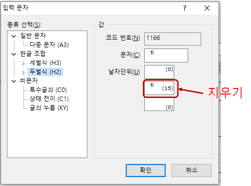 이렇게 해서 'ㅔ'가 삽입되었습니다. 이제 확인을 누르고,