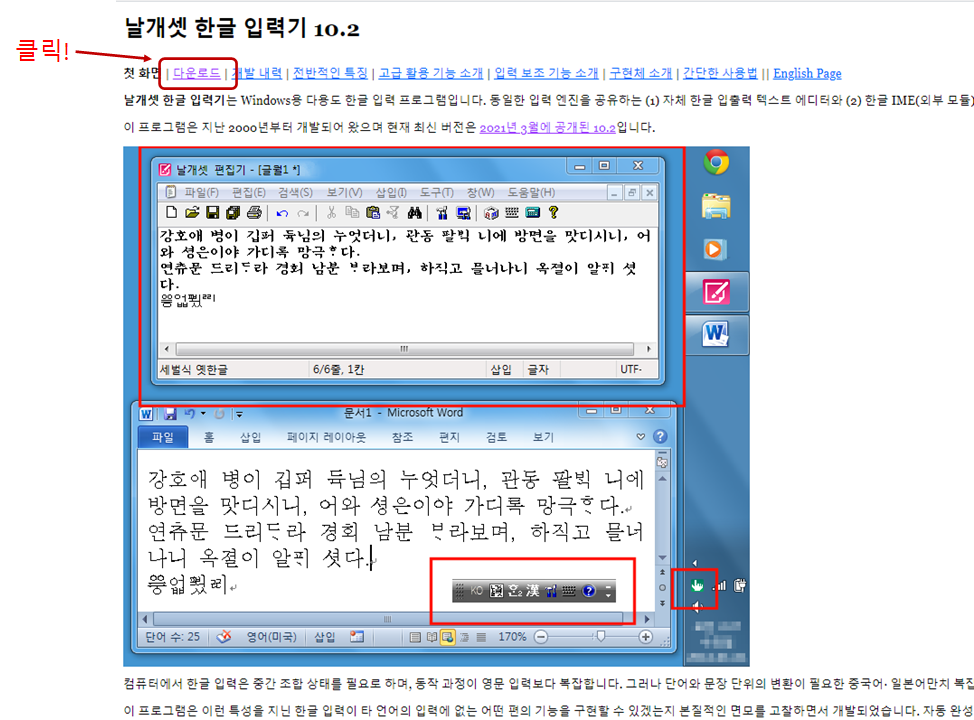 이렇게 검색 상단에 날개셋 한글 입력기가 뜹니다. 여기를 클릭하고 들어갑니다.