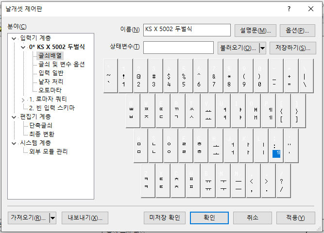 이번에는 한글 'ㅔ'을 문자 ';'로 바꾸는 것이기 때문에 한글 조합 -> 두벌식에서 낱자 단위 두 번째에 위치한 'ㅔ'를 지워줍니다.