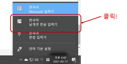 그리고 날개셋 한글 입력기를 클릭하면 비로소 적용이 끝이 납니다.