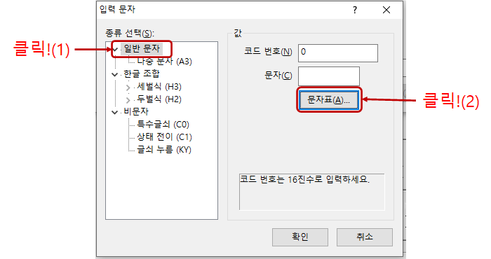위 창이 열리면 왼쪽의 일반 문자를 클릭하고 코드번호를 0으로 바꿔줍니다. 저희는 지금 ';'를 'ㅔ'로 바꾸려고 하고 있습니다. ';'은 문자이기 때문에 일반 문자에 ';'에 해당하는 코드 번호가 입력되어 있습니다. 그래서 일반 문자의 이 코드를 0으로 바꾸어 ';'문자가 사라지게 만드는 것입니다. 코드번호를 0으로 바꾸면 다음과 같이 됩니다.