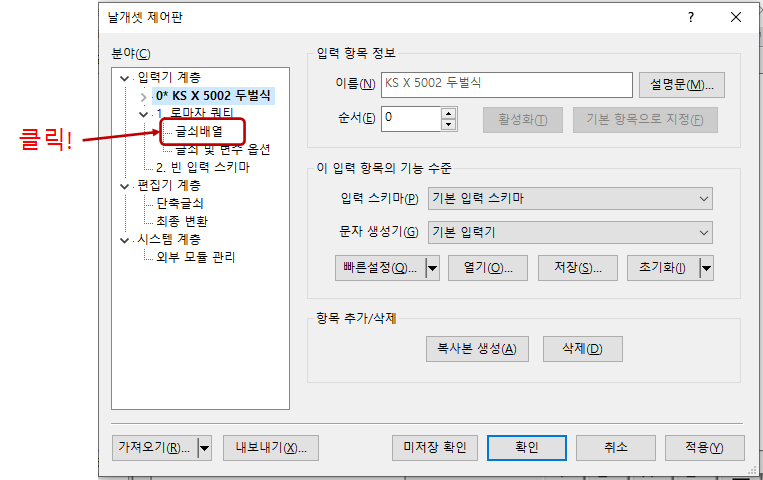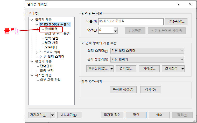 날개셋 제어판을 통해서 모든 자판 배열을 수정했으면 이제 이 자판 배열을 적용시켜야 합니다. 적용시키는 방법도 간단합니다.