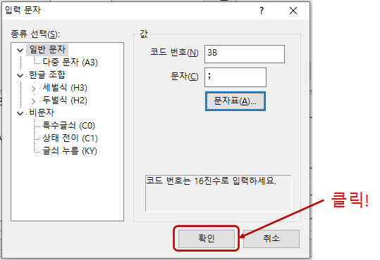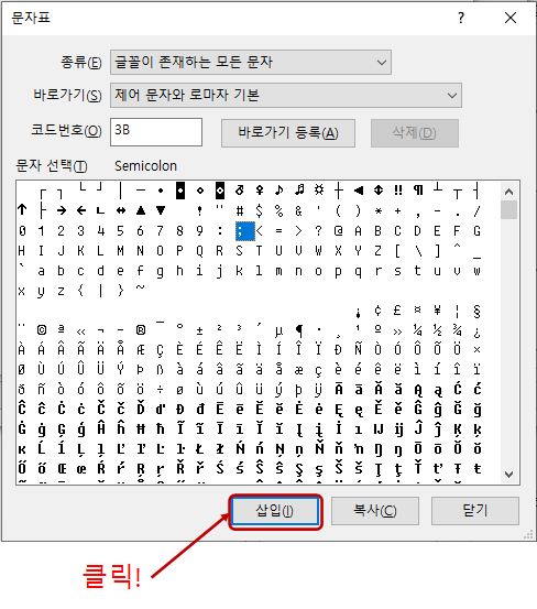 문자표에서 ';'를 찾아서 클릭하고 삽입을 클릭합니다.
