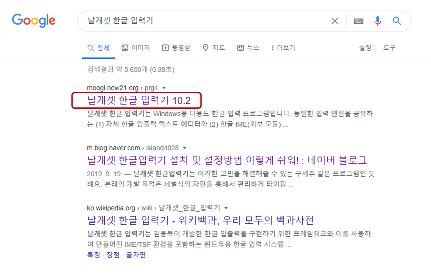 날개셋 한글 입력기를 사용하려면 우선 다운로드부터 해야 합니다. 간단하게 구글에 '날개셋 한글 입력기'라고 검색하면,
