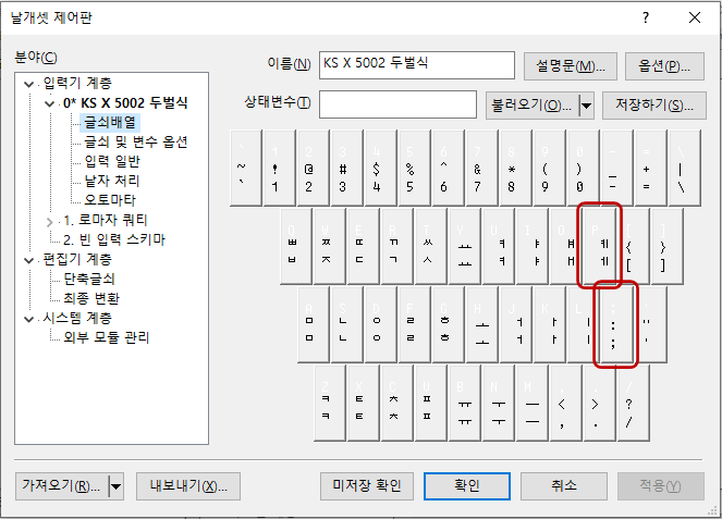 이 자판 배열은 한글 자판의 경우 ㅔ와 ;의 위치만 바뀌어 있습니다. 따라서 한글 자판부터 수정해보도록 하겠습니다. 다음과 같이 날개셋 편집기의 입력기 계층에서 두벌식 자판의 글쇠배열을 클릭합니다.