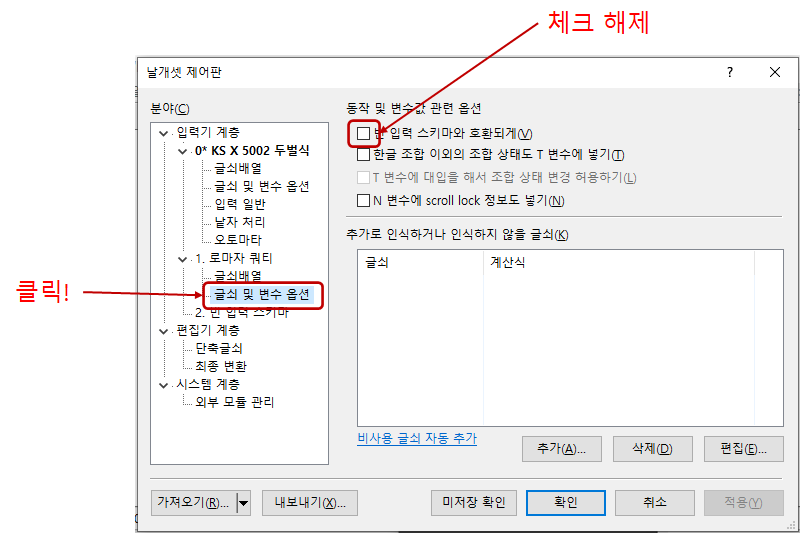 날개셋 제어판에서 로마자 쿼티의 글쇠 및 변수 옵션을 클릭하고 '빈 입력 스키마와 호환되게'의 체크박스에 체크를 해제합니다. 그리고 적용 및 확인을 클릭하면 문제가 해결될 것입니다.