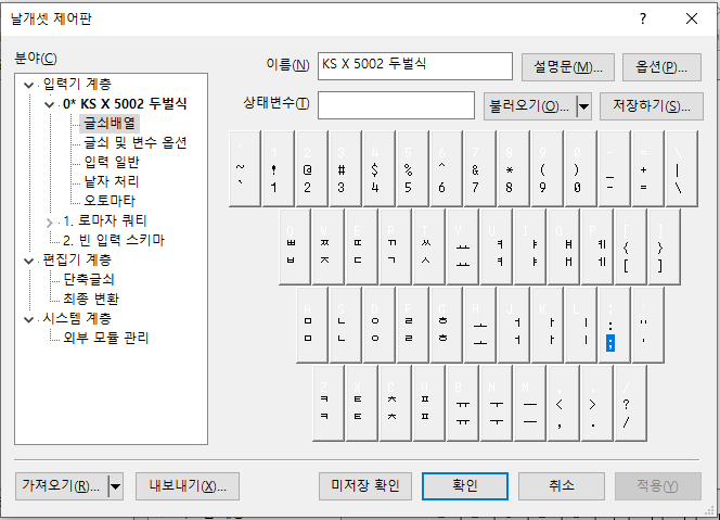 짠! 'ㅔ'를 ';'로 바꾸었습니다. 나머지 'ㅖ'와 ':'도 같은 방법으로 바꾸어 줍니다. 자판을 모두 수정하면 적용을 클릭합니다. 이제 영문 자판 배열을 바꿔보겠습니다.