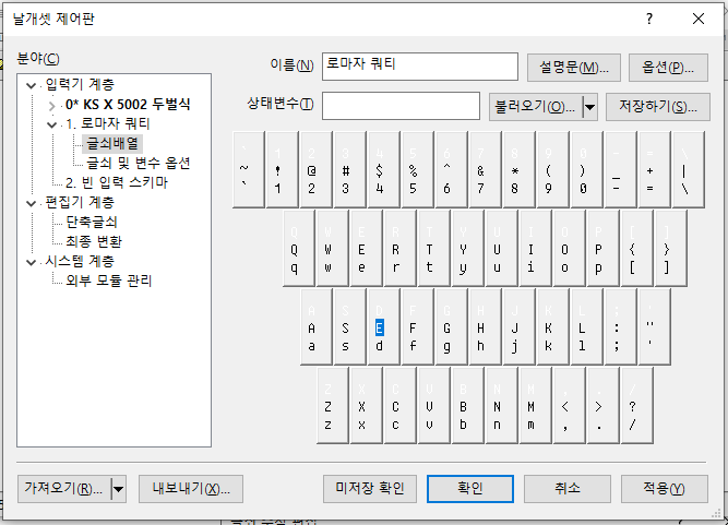 짠! 'D'가 'E'로 바뀌었습니다. 자판 배열을 모두 수정하면 적용을 먼저 클릭하고 확인을 클릭합니다.