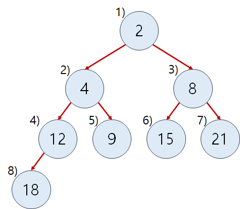 - 더 이상 바꿀 수 없을 때까지 부모와 우선순위를 비교하고 자리를 바꾸는 알고리즘을 반복합니다.