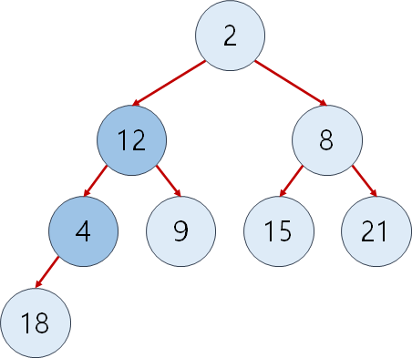 우선순위를 비교하여 2와 12의 위치가 바뀌었습니다. 다시 부모 노드인 4와 우선순위를 비교합니다.