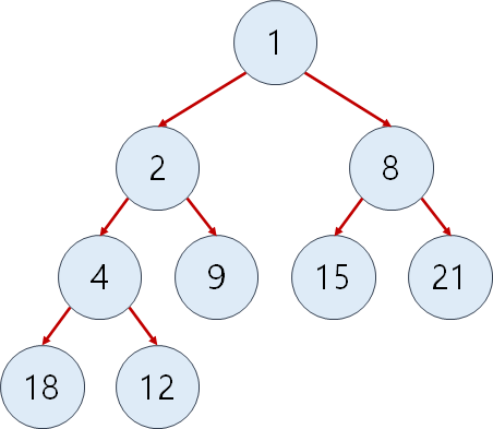 4의 우선순위가 더 높으므로 자리를 바꾸었습니다. 이번에는 자식 노드인 18과 우선순위를 비교합니다.