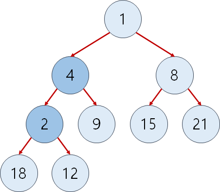 우선순위를 비교하여 2와 4의 위치가 바뀌었습니다. 다시 부모 노드인 1과 우선순위를 비교합니다.