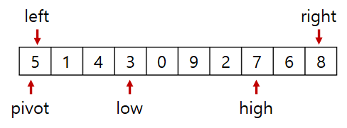 해당 배열에 위와 같이 몇 가지 포인터를 주었습니다. 우선 left와 right은 배열의 왼쪽 끝과 오른쪽 끝을 의미합니다. 그리고 pivot은 퀵 정렬 알고리즘을 수행하기 위해 설정해두는 기준을 가리킵니다. 배열의 어느 요소를 pivot으로 설정할 것인지는 프로그래머가 결정하기 나름입니다. 이번 예시에서는 배열의 왼쪽 끝 요소를 pivot으로 설정했습니다. 그리고 low와 high는 각각 pivot을 제외한 왼쪽 끝과 오른쪽 끝을 가리킵니다.