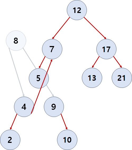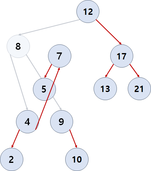 노드 8의 왼쪽 자식 노드로부터, 오른쪽 자식 노드만 타고 내려가면 노드 7이 나옵니다. 따라서 이를 대체 노드로 삼습니다.
