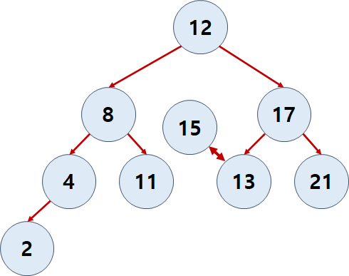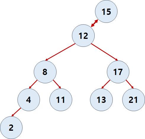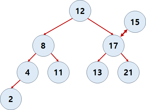 노드 12를 기준으로 왼쪽 자식의 노드는 모두 보모 노드보다 작고, 오른쪽 자식 노드의 값은 모두 부모 노드의 값보다 큽니다. 여기에 15를 저장해 보겠습니다.
