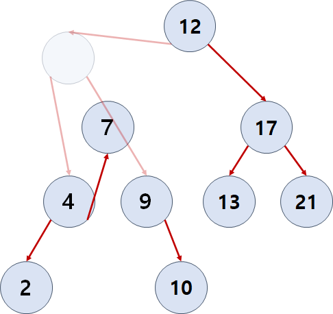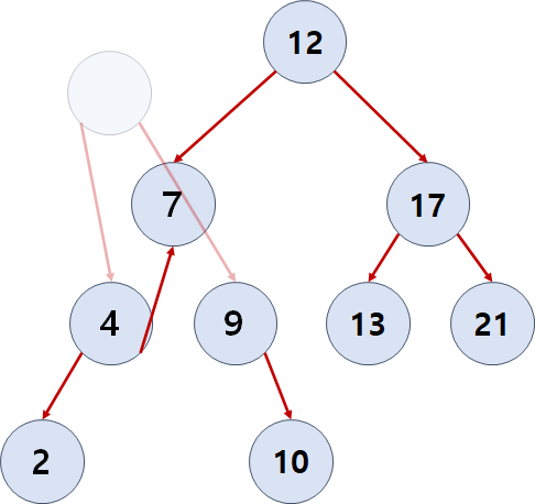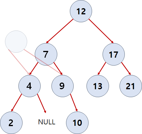 노드 7이 왼쪽 자식 노드로서 노드 4, 오른쪽 자식 노드로서 노드 10을 가리키게 해야 하고,