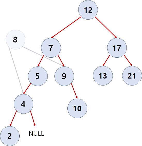 그리고 노드 4의 오른쪽 자식 노드는 사라졌으므로, 노드 4의 오른쪽 자식 노드로서 NULL을 가리키게 합니다.