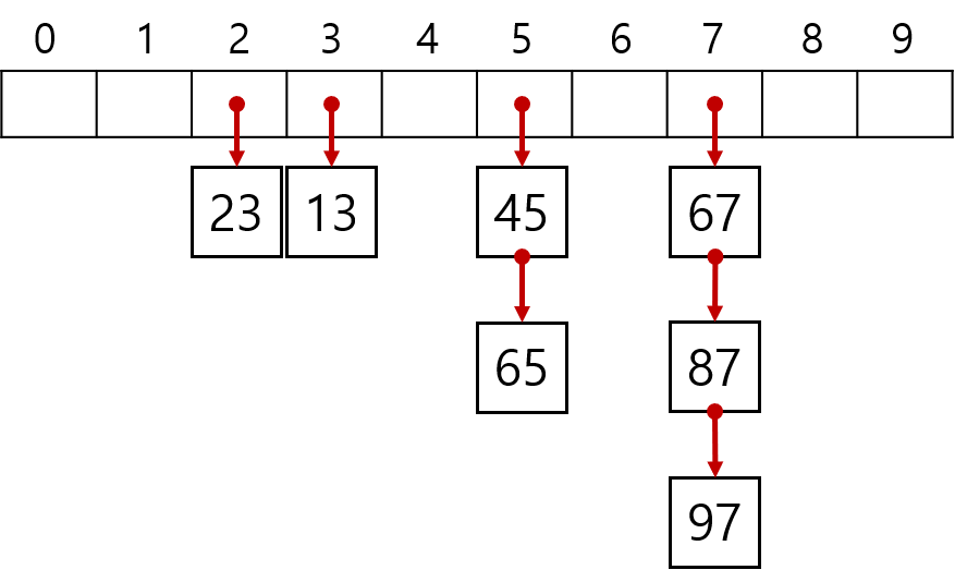 이번에 소개할 '체이닝'이라는 것은 앞서 소개한 충돌 해결책과는 해결 방식이 근본적으로 다릅니다. 앞서 소개한 유형들을 가리켜 '열린 어드레싱 방법'이라고 합니다. 이런 유형은 충돌이 발생하면 다른 자리에 대신 저장하는 식의 해결 방식을 가지고 있습니다. 반면 이번에 소개하는 체이닝과 같은 유형을 가리켜 '닫힌 어드레싱 방법'이라고 부르며, 이들은 충돌이 일어나도 자기 자리에 저장하는 식의 해결 방식을 가지고 있습니다.