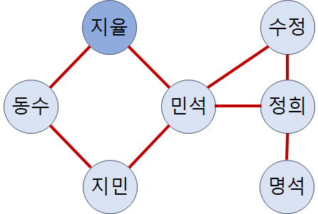 지율에게 비상 메시지가 도착했고, 지율로부터 시작해서 모두에게 비상 메시지를 전달해야 합니다. 이번에는 DFS와는 달리, 지율이 연락할 수 있는 모든 사람들에게 연락합니다.