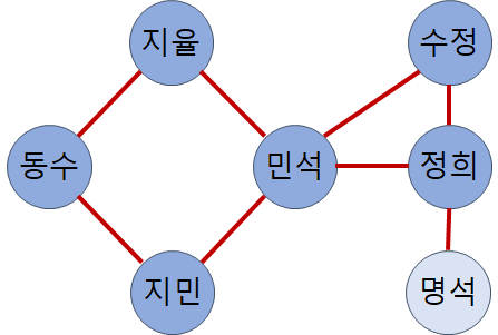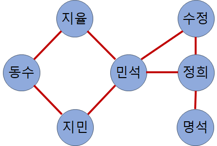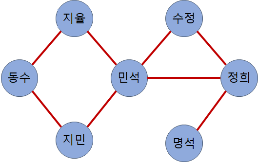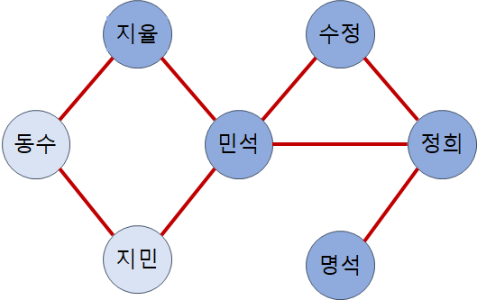 그리고 이어서 민석이가 연락을 할 차례입니다. 그런데 민석이와 연결되어 있는 지민은 이미 동수에게서 연락을 받았으므로 민석은 지민이에게는 연락하지 않고, 수정과 정희에게 연락합니다.