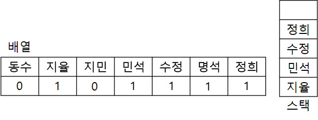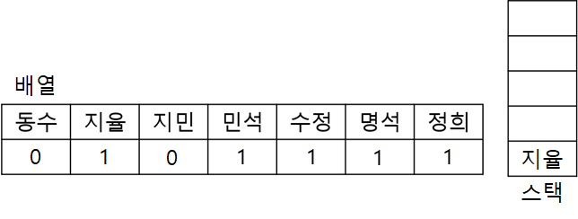지율을 떠나 민석을 방문했으므로 스택에 지율을 저장하고, 배열의 민석에 해당하는 요소의 데이터를 1로 바꾸어 방문했음을 기록합니다. 이어서 민석 → 수정 → 정희 → 명석 순서로 방문하면 다음과 같이 됩니다.