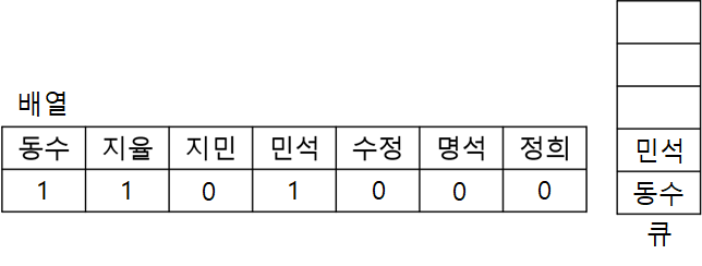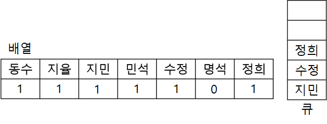똑같이 큐에서 지민을 꺼냅니다. 지민은 연락할 정점이 없습니다. 이어서 큐에서 나오는 수정 또한 연락할 정점이 없습니다. 큐에서 정희를 꺼내고 정희는 명석에게 연락합니다.